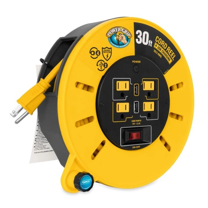 Camco Power Grip 30-Foot Extension Cord Reel W/ USB Charging Ports