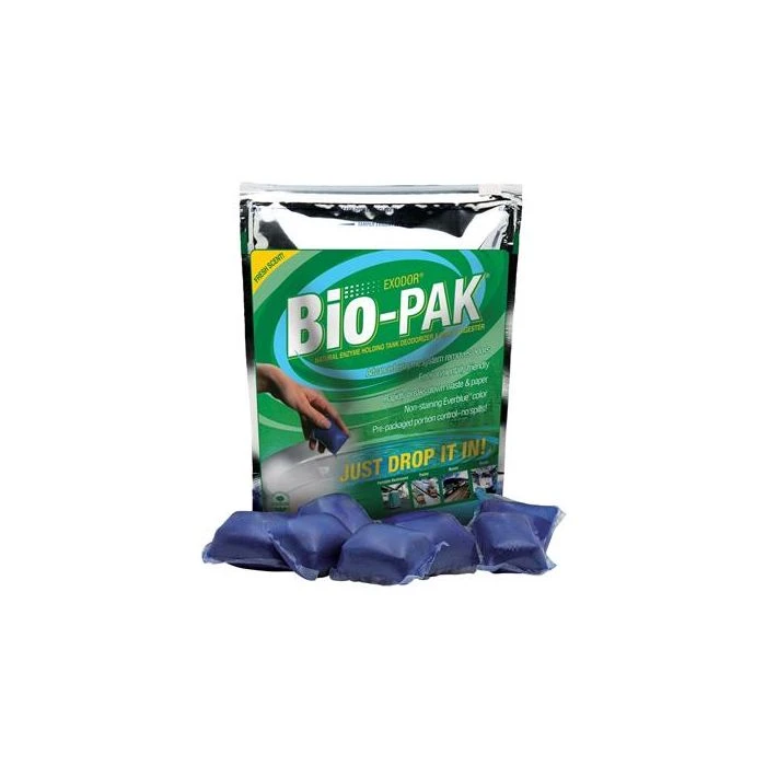 | Features | Bio-Pak provides portion control and is easy to use with no messy liquids, just drop it in! The environmentally friendly enzyme formula starts working immediately to control odors and break down solids in the waste tank. Liquefies all types of toilet paper, eliminating the need for special toilet paper! Continued use ensures that pipes, valves, and seals will be trouble-free. |